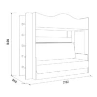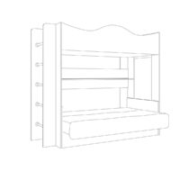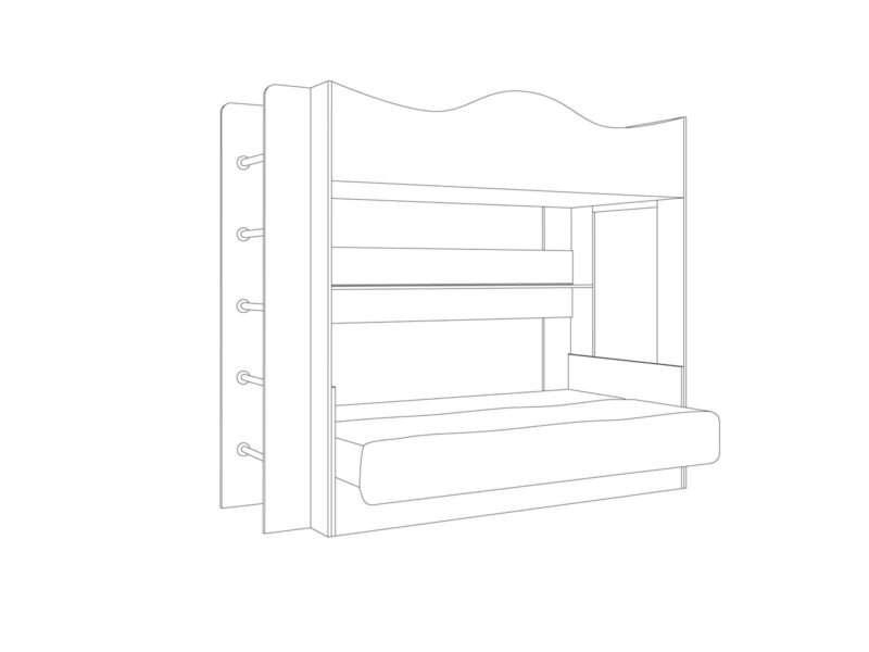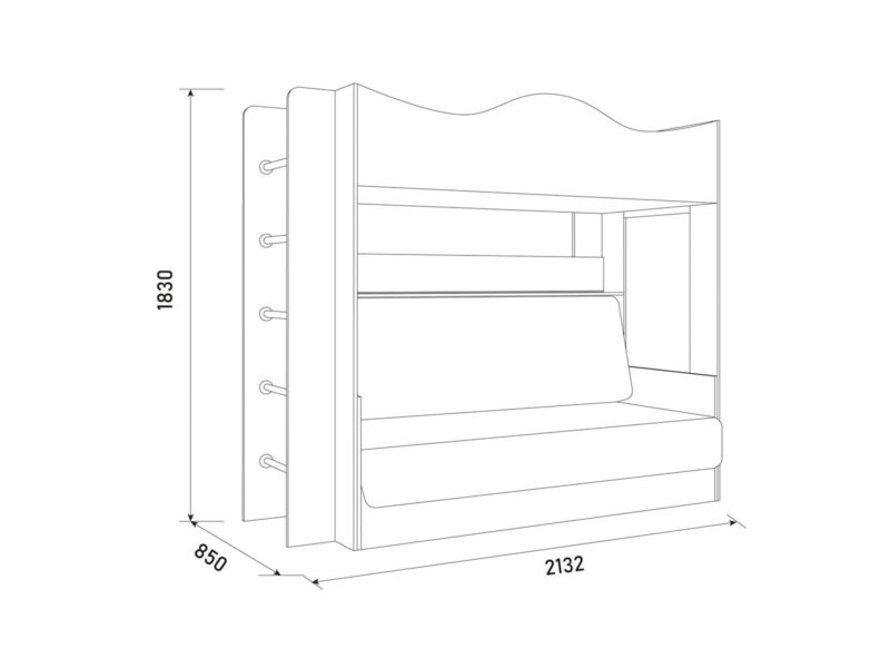 Под верхним ярусом располагается диванный блок с раскладывающимся диваном-кроватью, с механизмом трансформации «Книжка» внутри которого расположен бельевой короб. В основании под матрас предусмотрен мебельный щит, что обеспечит надежность и дополнительную прочность.